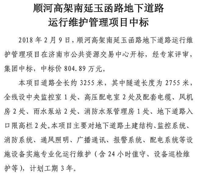 順河高架南延玉函路地下道路 運(yùn)行維護(hù)管理項(xiàng)目中標(biāo)